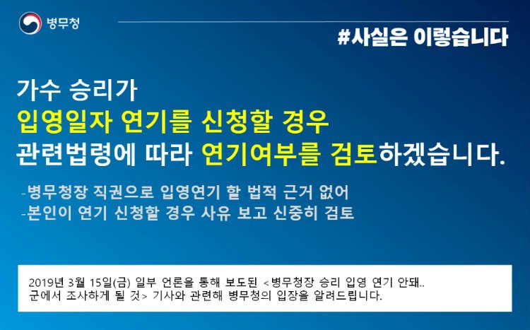 병무청 A Twitter 가수 승리 입영연기 관련 병무청 입장 가수 승리가 입영일자 연기를 신청할 경우 관련 법령에 따라 연기 여부를 검토하겠습니다 자세히 Https T Co 4eumshxiii