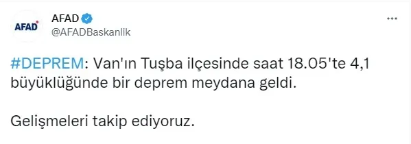 Vanın Tuşba ilçesinde 1759da 38 şiddetinde deprem olurken saat 1805de aynı yerde 41 büyüklüğünde bir deprem daha meydana geldi. Bu depremden 6 dakika sonra saat 1805te yine Tuşba merkezli 41 büyüklüğünde bir deprem daha meydana geldi. AFAD tarafından gelen son dakika haberine göre.